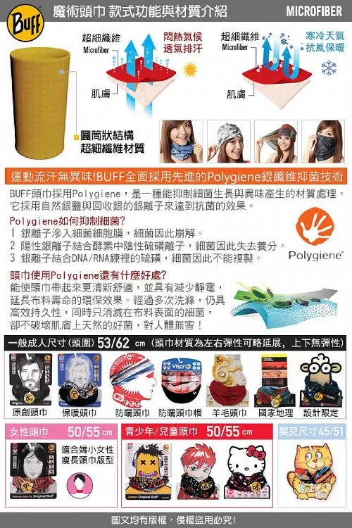 來自西班牙原創的BUFF魔術頭巾 堅持西班牙設計與製造,無污染的材質均通過歐盟布料組織檢驗 創新的『無接縫圓筒頭巾』設計,具備多種變化與用法,充分展現你的創意 「環保紡織標準100」OKEO-TEX STAND 100材質認證 OKEO-TEX STAND 100於1992年由11個歐洲國家共同創立所制定 檢測是否殘留影響人體健康之有害物質,協助消費者辨認符合環保標準的紡織品 BUFF的產品已全面通過OKEO-TEX STAND 100檢測標準,具公信力的保障 針對3歲以下的寶寶設計,尺寸更符合,花色更可愛活潑 透過Polygiene專利技術,有效降低細菌繁殖導致的異味 運用銀離子處理的布料,抑制各種有害微生物成長 防止在活動時的流汗而造成細菌繁殖 銀離子不對皮膚產生副作用,亦【博客來週年慶-電視都在報】不會影響布料原本的機能 具有耐久性且不會隨洗滌次數減少作用性 Polygiene能有效且迅速的排除有害的細菌和真菌 Polygiene高性能抗菌能維持始終如一的舒適使用感 推薦使用 多樣用途,並有超強彈性與高延展性,適應各種頭圍 具備吸濕、排汗、快乾、防曬、防塵、抗風之特性 適合各種運動或休閒時使用,擁有眾多獨家花色選用 尺寸:Baby(頭圍4551CM) / 攤平測量約43cm x 20cm 材質:超細纖維 產地:西班牙 |